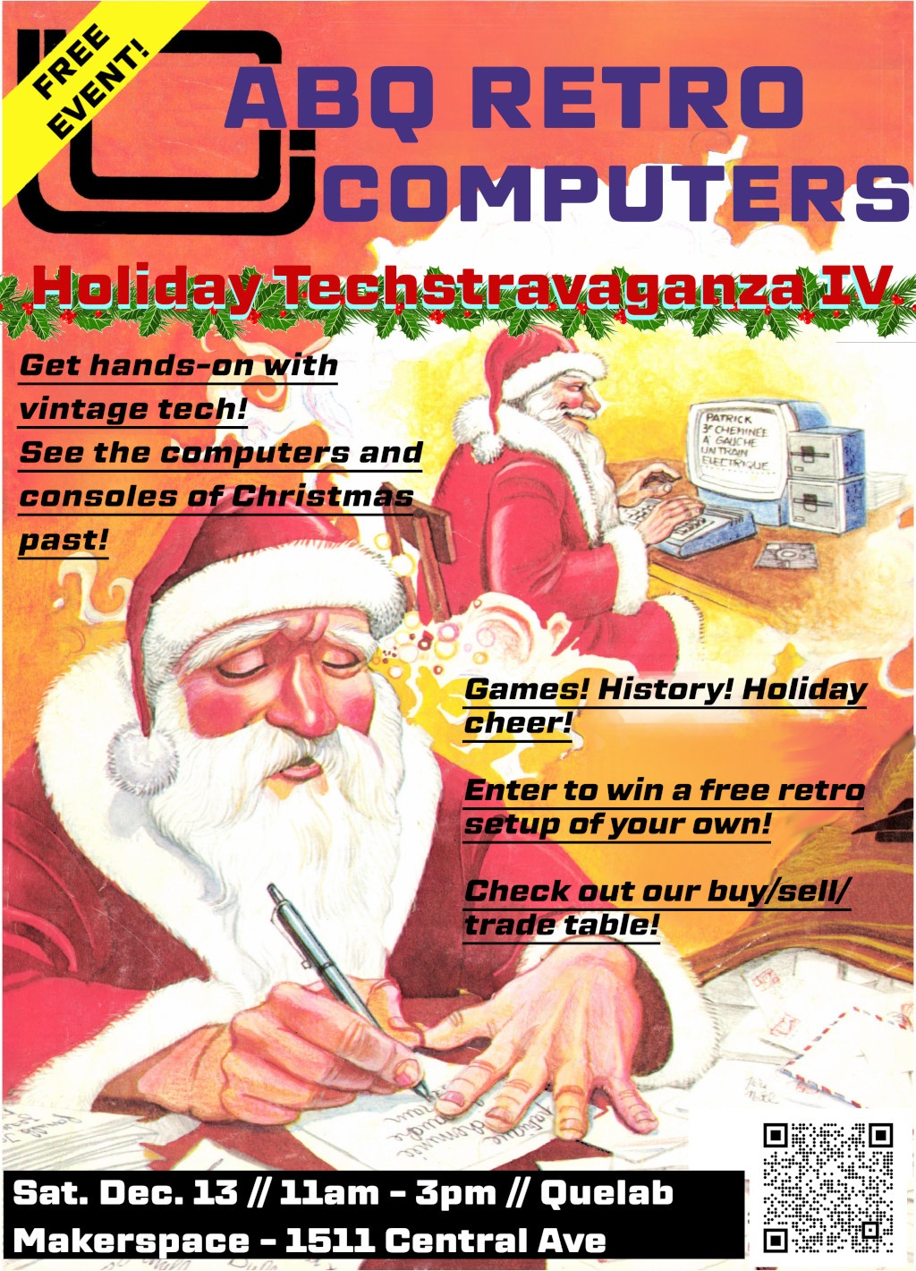 Get hands on with vintage computer technology and games. Consoles and Christmas past. Give-aways and trades.
