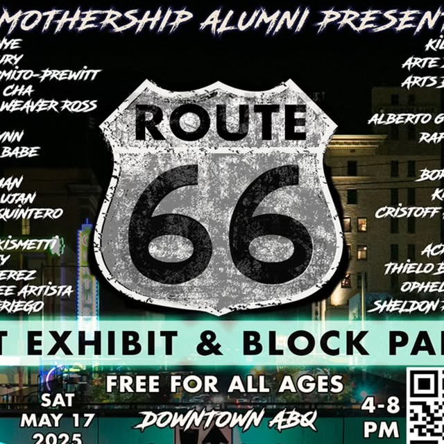 The Mothership Alumni on Instagram: "Saturday, May 17th in Downtown Albuquerque tap in for the Route 66 Art Exhibit & Block Party! featuring 30+ artists, live music, live printing, and more! 🎨 Gallery Artists repping NM and beyond: @mmmmnm_a @carvinglightning505 @Bugeyed_girl @kittykatsuu @zerobey0 @rafwillems72 @TeaLadyArts @ohamen12 @gotrek_gurnisson @thielo.kom @halfdeaddaddy @xavier.quintero.12 @jkismetti @adipottyart @ypchz @deepseeartista @dumblonde.decoupage @artsbymeech @geoslensnm @demkouno @ophie_abq @trescoatz @dweaverross @bornpsychoart @themenagerieartstudio @sheldorama @acr1dapple @spelleo @calmanenacalma 🎶 Live music: @adobedisco | @crownshymusic | Tews Rock | DJ Aumin + DJ Decrepit 👕 Live screenprinting from @111tshirtlab 🖼️ Live lithograph printing by UNM Print Club 🛹 Vibes up at @microwaveskateshop Come vibe, celebrate 100 years of Route 66, and support local artists, makers, and musicians! RSVP on mothershipalumni.com to get a free sticker pack day of the show! Big shoutout to @newmexicotourismdepartment and their support through the Route 66 Centennial Grant Program."
